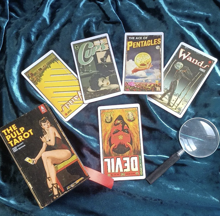 So I was giddy when I found this new deck (already sold out!) by Todd Alcott that merges the Smith-Rider-Waite deck and graphic art reminiscent of classic cinema posters, Mad Men era advertising, and, of course, pulp novel covers.