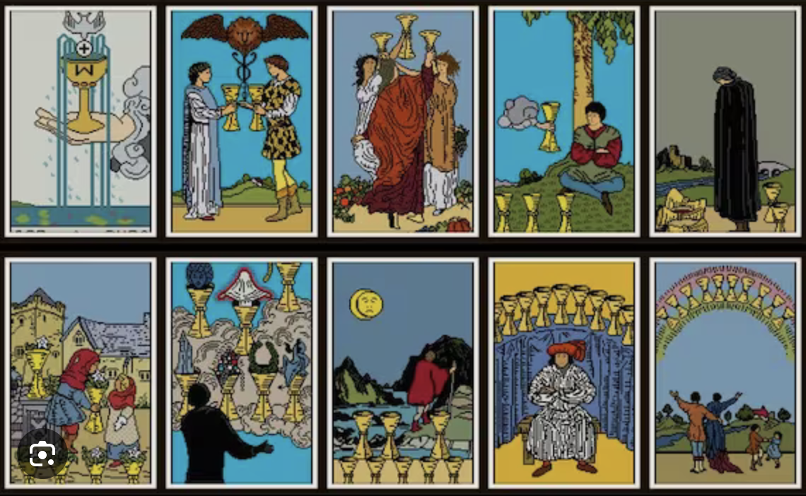 The Cups Suit is about water. This element relates directly to the heart as a center of emotions and spirituality.