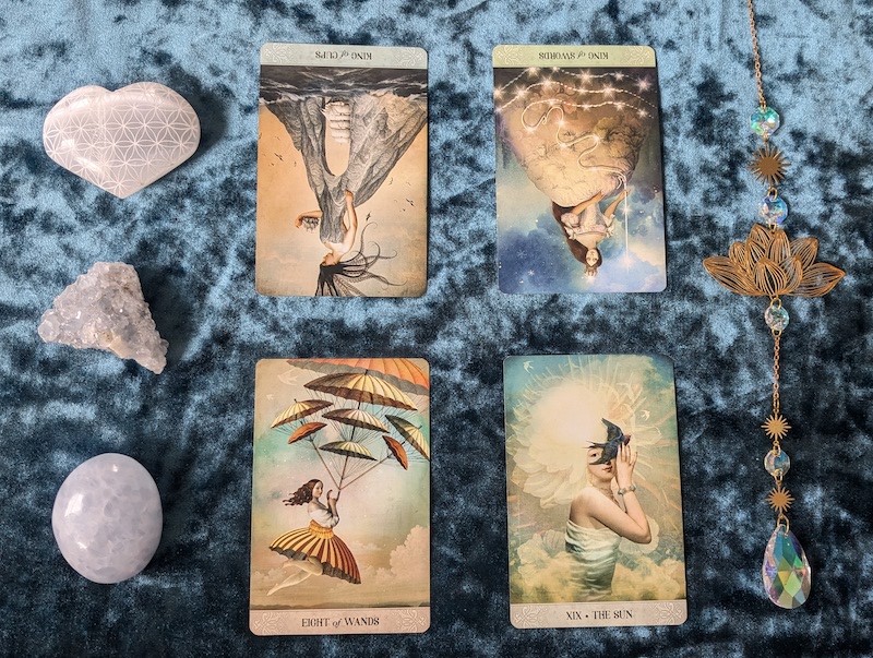 The solution for this in the 8 of Wands is taking that heavy heart outside with a focus on healing by moving your body to move the feelings.