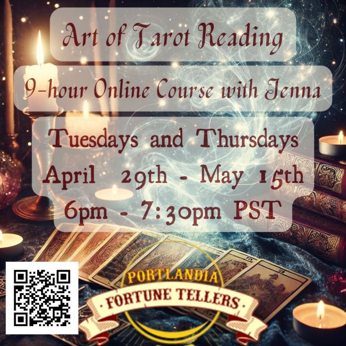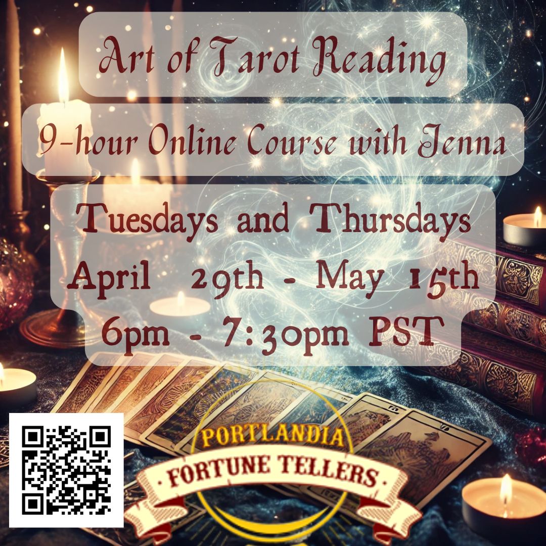 My 9-hour online class in the Art of Tarot Reading will run on Tuesdays and Thursdays from 6pm to 7:30pm PST starting on April 29th through May 15th. This will likely not be running again for a long time, so now is the time.